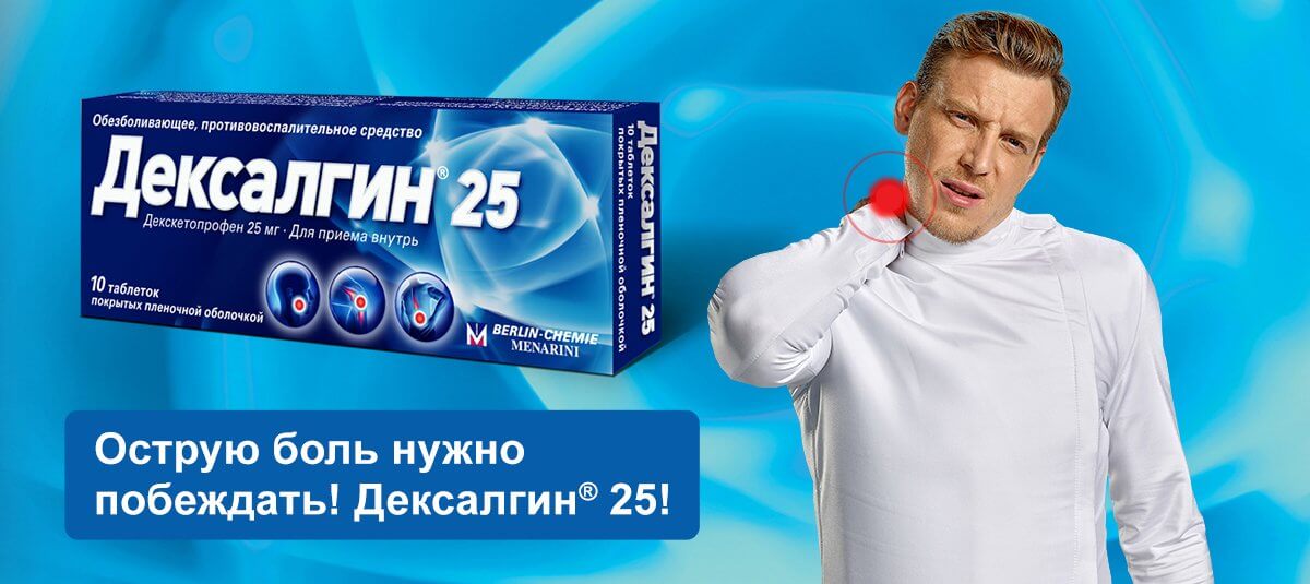 Dexalgin® 25 рекомендуется для симптоматического лечения острых болей легкой и умеренной интенсивности, таких как скелетно-мышечная боль, альгодисменорея и зубная боль.